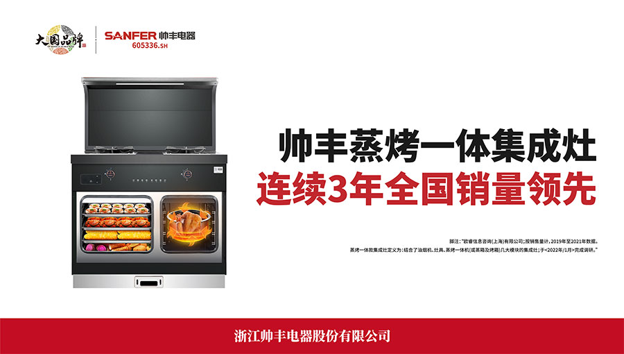 帥豐于2020年10月19日在上交所掛牌敲鑼,成為集成灶板塊首家主板上市企業(yè)。股票簡稱:帥豐電器,股票代碼:605336.SH。在科技創(chuàng)新中,帥豐擁有11項中國發(fā)明專利,177項中國實用新型專利,142項中國外觀設(shè)計專利。通過締造有溫度的產(chǎn)品,賦予廚電一體化、集成式的“智慧大腦”。根據(jù)歐睿國際調(diào)研數(shù)據(jù)顯示,帥豐蒸烤一體集成灶2019年、2020年、2021年連續(xù)三年全國銷量領(lǐng)先。