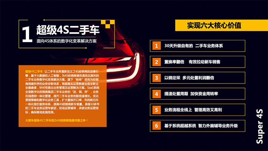車易拍聚合大搜車的SaaS服務能力和車易拍的在線拍賣交易能力,搭建了以拍賣交易為核心的二手車數字化供應鏈服務平臺,為二手車買家、賣家、檢測服務商、車務服務商等各個生態伙伴提供基于SaaS產品的業務數字化變革解決方案。拍賣生態伙伴基于SaaS產品實現業務在線和數據協同,形成行業聚合的數據共享和社會化服務能力共享,共同打造高效的二手車在線交易能力及服務體系。