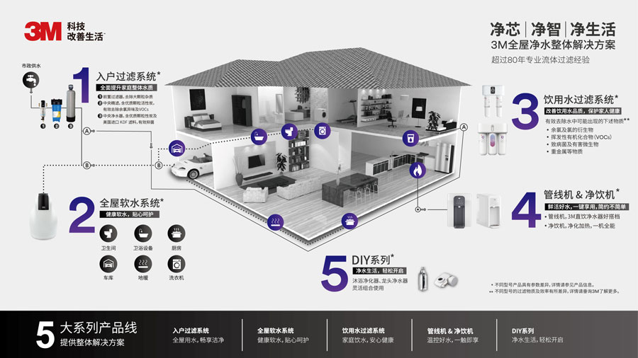 主要產(chǎn)品:3M全屋凈水解決方案(入戶過濾系統(tǒng)、全屋軟水系統(tǒng)、飲用水過濾系統(tǒng)、管線機(jī)和凈飲機(jī)、DIY產(chǎn)品)