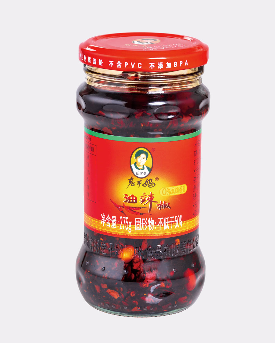 主要產(chǎn)品:老干媽牌油辣椒系列(油辣椒、風(fēng)味豆豉、香菇、精制牛肉末豆豉、辣三丁、香辣脆、干煸肉絲、風(fēng)味雞、肉絲豆豉)、火鍋底料(糟辣椒/植物油)、香辣醬、下飯菜、拌飯醬、風(fēng)味水豆豉、紅油腐乳、風(fēng)味腐乳、香辣菜、風(fēng)味糟辣剁椒(中辣/微辣)、姜蒜糟辣剁椒、番茄辣醬