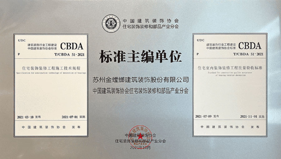 2021年,作為核心主編及實施單位參與了CBDA《住宅裝飾裝修工程施工技術規程》和CBDA《住宅室內裝飾裝修工程施工質量驗收標準》的制訂工作,以高標準嚴要求完成住宅裝飾行業第一部規范標準制定。