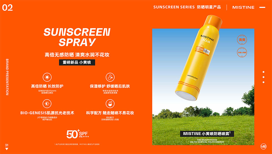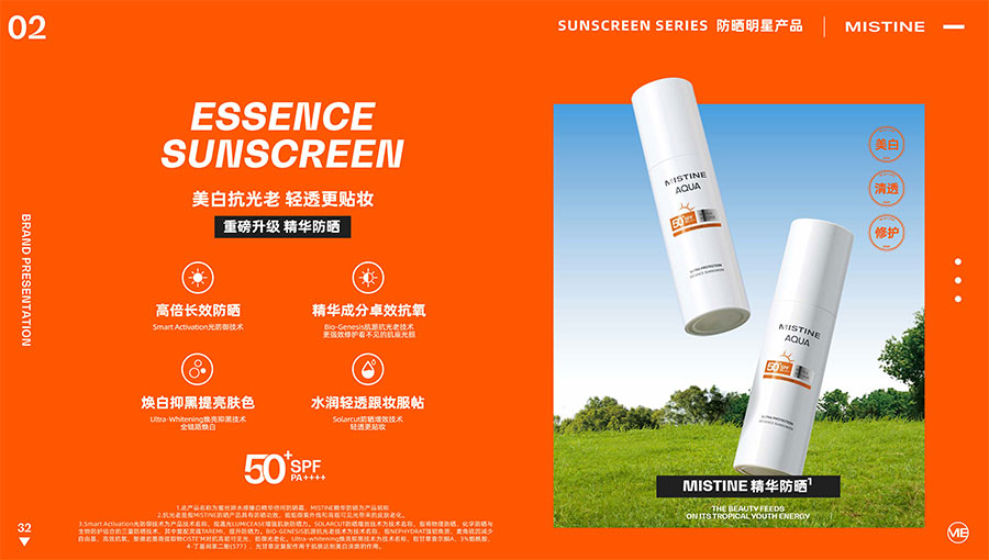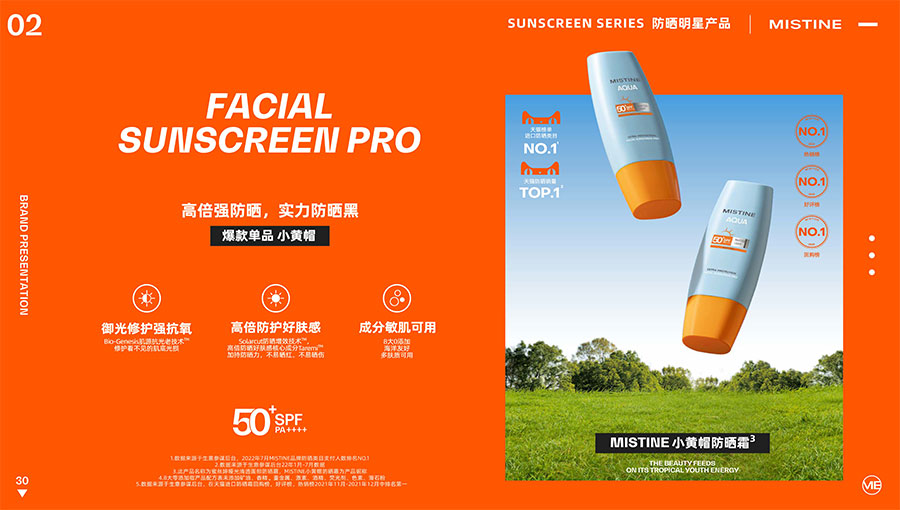 MISTINE蜜絲婷提出皮膚科學、前沿科技、靈魂成分、熱帶美學、卓越功效、保護環境六大品牌價值,致力于為全球女性提供豐富、安全、高品質的美妝產品。基于MISTINE蜜絲婷品牌首席科學顧問——全球計算生物學權威之一、諾貝爾化學獎得主Arieh Warshel的研究,MISTINE蜜絲婷創新防曬品類推出「光生物學」防曬系統,提出“外層防護、中層修護和底層抗損”防曬新理念,引領防曬從“表面防護”進入“深度抗光老”新時代。同時,MISTINE蜜絲婷還持續深耕專業彩妝市場,以熱帶美學基因造就產品防水防汗、高倍耐曬、長效持妝的優勢,圍繞消費者需求打造多元化的產品矩陣,引領防曬、底妝賽道發展。