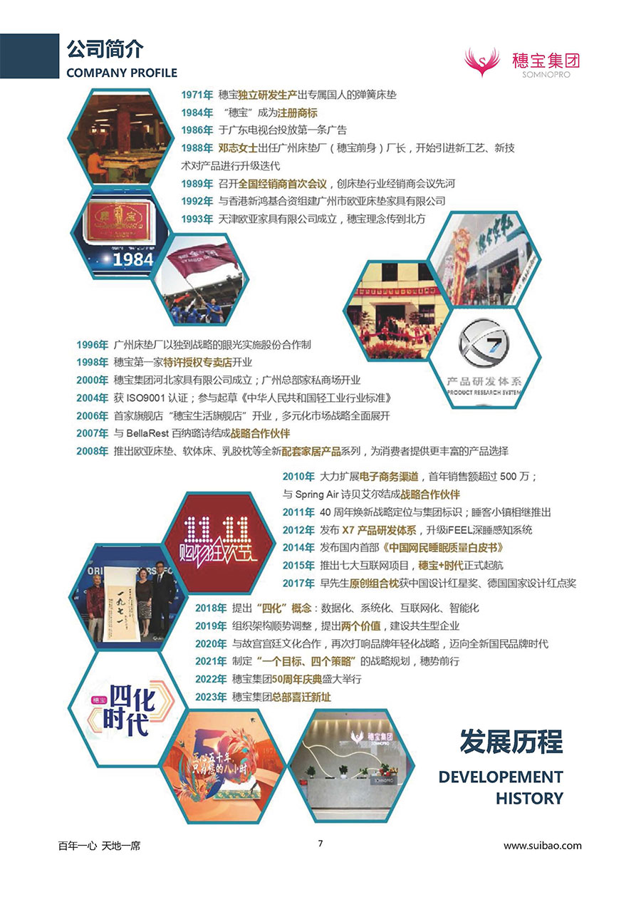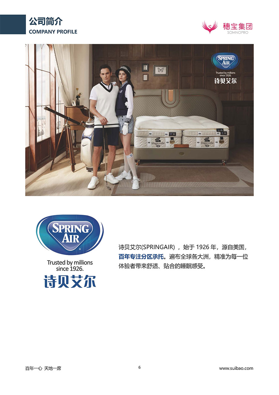 至今,穗寶集團旗下擁有多個來自世界各地的優質品牌,包括:穗寶、詩貝艾爾、百納璐詩、睡客小鎮、Mr.Z早先生等;此外,穗寶集團從世界各地甄選適合不同消費者的優質睡眠產品,定制屬于您的睡眠空間。如今,穗寶集團形成以研發、生產和銷售床墊為主營業務,涉及家具、家居裝飾、酒店配套等多項業務的企業群體。