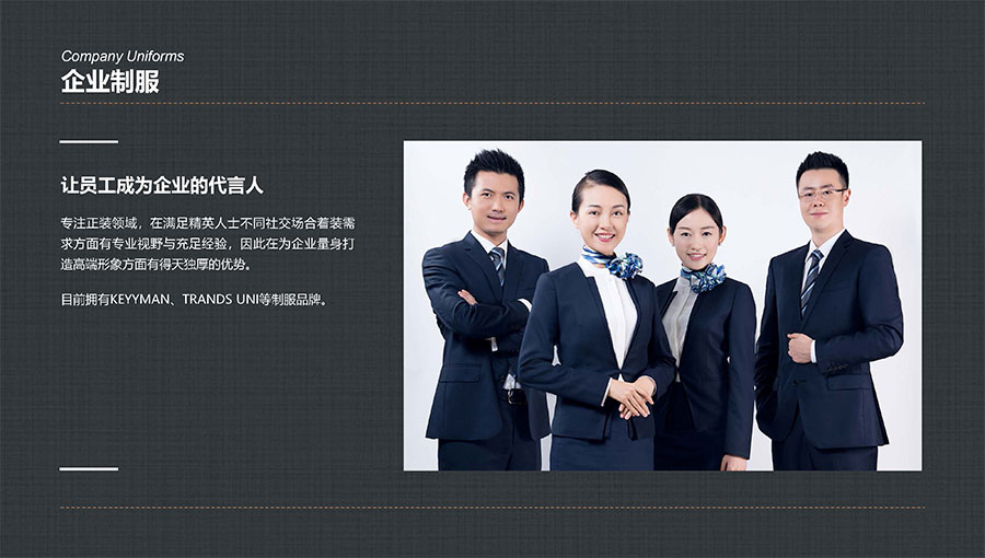 凱門品牌(KEYYMEN):高級職業裝品牌,企業形象定制專家。以精湛工藝及最優性價比打造高品質、個性時尚的企業形象,專屬于那些為理想、為事業打拼,并在成功過程中享受生活的職場團隊及精英人士。