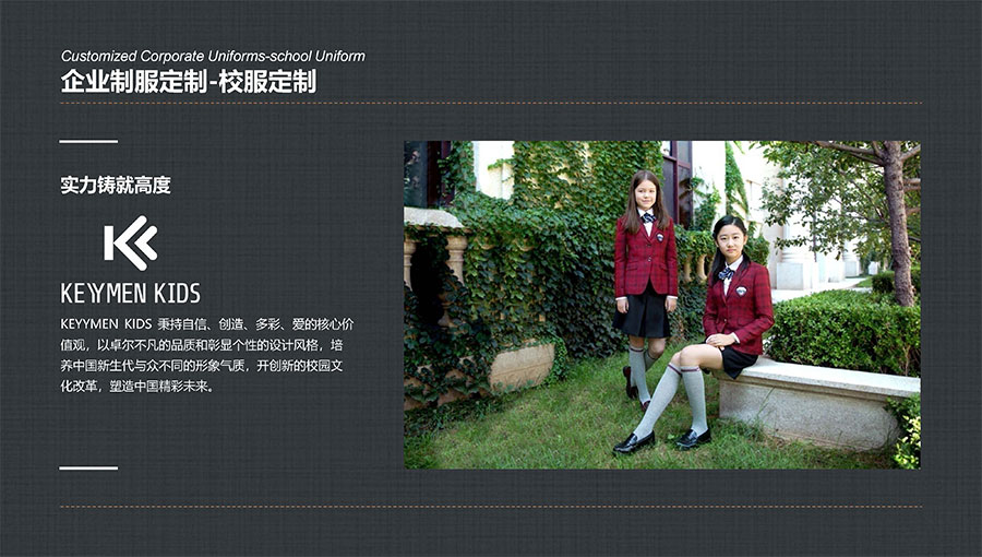 凱門學生裝(KEYYMEN KIDS)秉持自信、創造、多彩、愛的核心價值觀,堅持“領先一步,步步領先”的品牌理念,致力于打造最具影響力的學生裝品牌,為中國青少年形象代言,以卓爾不凡的品質和彰顯個性的設計風格,培養中國青少年與眾不同的形象氣質。