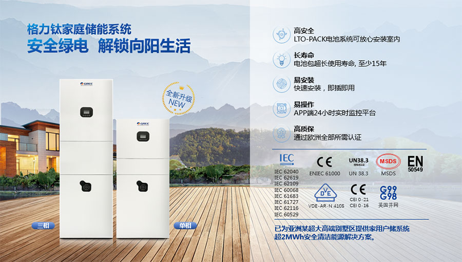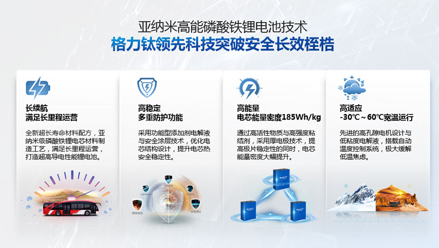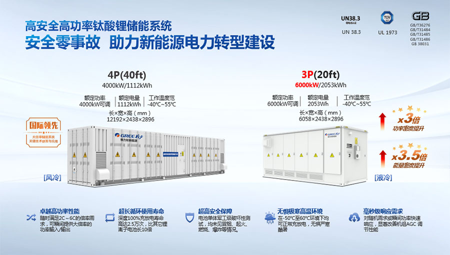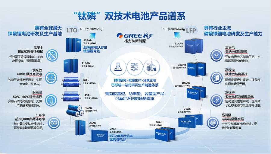 鈦酸鋰電池技術是新能源行業唯一獲得中國專利獎金獎的鋰電池產品技術,其應用于儲能電池和動力電池具有超高安全性,在快充放、耐寬溫、長壽命等方面同樣具有卓越的性能。格力鈦電池系列產品具有不起火不爆炸高安全、6分鐘快充放、-50℃至60℃耐寬溫特性,循環充放電次數高達30000多次,使用壽命長達30年。格力鈦電池經利鋸切割、尖針穿刺、強力擠壓、電鉆沖孔、短路充放電、高溫加熱、槍擊等極限條件測試,均未發生冒煙、起火、燃燒、爆炸等現象。