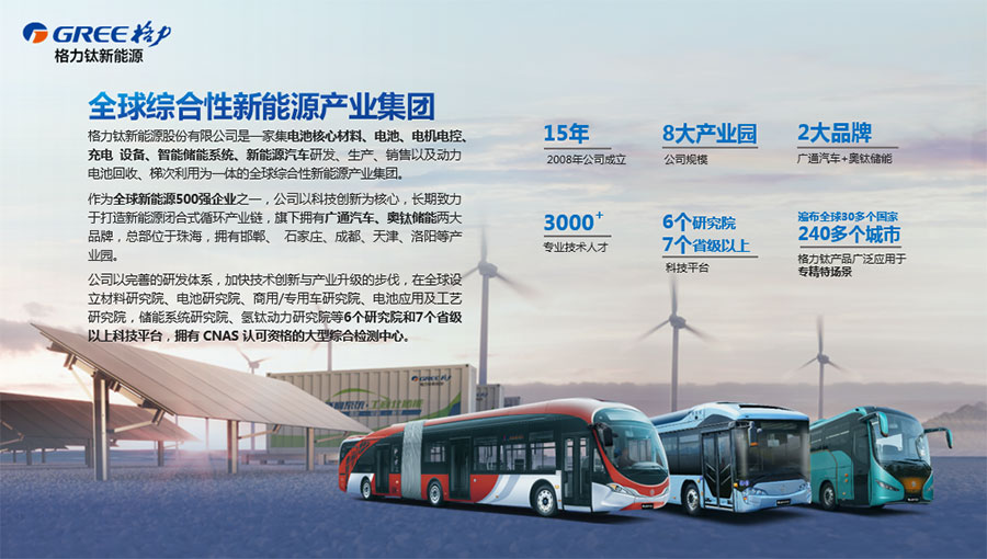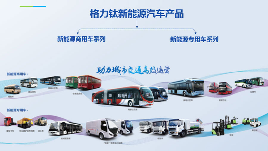 格力鈦新能源股份有限公司一直致力于研發混合動力、氫燃料、純電動車等一系列節能減排的新能源環保型客車/公交車/物流車,所研制產品體現了電子化、智能化、綠色化、節能化的鮮明特色,堅持以產品開發和市場開拓相結合的經營方針,引進國外先進客車生產技術,力爭通過資本、技術及產業優勢,做大區域市場,進軍國際市場,力爭成為中國新能源汽車的領軍企業集團。