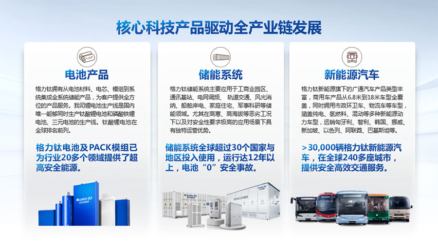 以完善的研發體系,公司加快技術創新與產業升級的步伐。公司研發的格力鈦電池安全性長期領跑行業,憑借具有高安全、大倍率、快充放、耐寬溫、長壽命等特性,被選為“國家制造業單項冠軍產品”,廣泛應用于新能源汽車以及工商業園區、通訊基站、電網調頻、軌道交通、風光消納、船舶岸電、家庭住宅、軍事科研等儲能領域,具有廣闊的市場前景和應用價值。目前,格力鈦儲能產品已在丹麥、瑞士、芬蘭等全球30多個國家和地區使用,新能源汽車產品在北京、杭州、武漢、成都、青島、哈爾濱、包頭、海口等全球240多座城市運營,12年全球零電池事故安全運行。