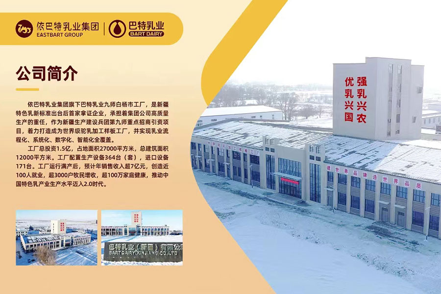 巴特乳業(yè)新疆塔城工廠是依巴特乳業(yè)集團(tuán)核心業(yè)務(wù)板塊之一,總投資1.5億,占地40余畝,承擔(dān)著高質(zhì)量生產(chǎn)的重任。地址位于新疆建設(shè)兵團(tuán)第九師白楊市巴克圖經(jīng)濟(jì)技術(shù)開發(fā)區(qū)產(chǎn)業(yè)大街1號(hào)。作為新疆生產(chǎn)建設(shè)兵團(tuán)第九師重點(diǎn)招商引資項(xiàng)目,著力打造成為世界級(jí)駝乳樣板工廠,并實(shí)現(xiàn)乳業(yè)流程化、系統(tǒng)化、數(shù)字化、智能化全覆蓋。全面投產(chǎn)后年產(chǎn)值約12億元。工廠投產(chǎn)后年產(chǎn)5000噸駱駝乳粉,年產(chǎn)全脂純生駝乳粉1500噸,年產(chǎn)駝乳配方粉1500噸;項(xiàng)目二期計(jì)劃建設(shè)常溫奶生產(chǎn)線一條,建設(shè)酸奶生產(chǎn)線一條,年產(chǎn)駱駝乳純奶1000噸;年產(chǎn)駱駝純酸奶1000噸。以滿足國內(nèi)市場(chǎng)及歐盟、中東、中非、東南亞等國家和地區(qū)出口需求。