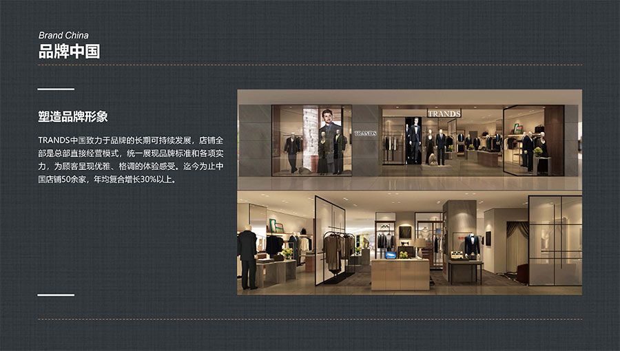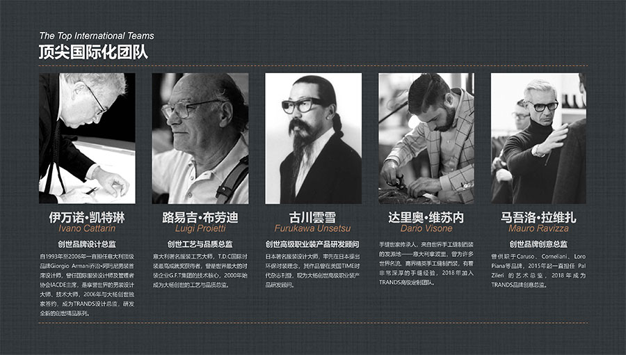 創(chuàng)世品牌(TRANDS):創(chuàng)建于1995年,是當(dāng)今中國(guó)高級(jí)男裝的代表品牌之一。TRANDS創(chuàng)世成衣產(chǎn)品及量身定制的西裝以其至臻品質(zhì)和精湛工藝,贏得眾多國(guó)際政商精英多年來的青睞。