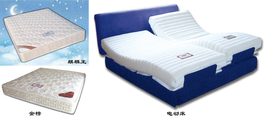 主導產品麒麟牌系列床墊,具有多種規格款式,有加強型、麒麟王型、新麒麟王型、冬夏木板、棕板王型、銀麒麟B型、金麒麟型、華貴型、金榜麒麟型、椰棕型、麒麟袋裝王床墊和麒麟電動床等。床墊選用優質彈簧鋼絲和高檔原材料,采用國際標準精工制作,經國家家具檢測中心按北歐標準多次測試,破壞性試驗達10萬次以上,16噸壓路機反復碾壓,仍完好無損。麒麟牌床墊具有軟硬適中、豪華美觀、經久耐用之特點。麒麟牌床墊在國家級歷次質量檢測中均名列前茅,連續十幾年獲國家A級產品,并榮膺“中國馳名商標”殊榮。