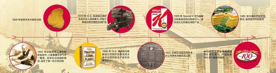 一百多年來,家樂氏公司秉承“更健康、更營養(yǎng)美味和更高質(zhì)量”的信念以及“天然和優(yōu)質(zhì)”的高尚品質(zhì),不斷地推陳出新,先后推出系列經(jīng)典 產(chǎn)品如All-Bran®(1916年)和 Rice Krispies®(1928年)。隨著業(yè)務(wù)的發(fā)展,家樂氏公司開始拓展國際業(yè)務(wù):1914年Kellogg’s Corn Flakes®產(chǎn)品進(jìn)軍加拿大市場,1924年和1938年分別在澳大利亞的悉尼、英格蘭的曼徹斯特設(shè)立工廠。2007年,家樂氏成功進(jìn)入中國,并以銷售額接近120億美金的業(yè)績成為全球谷物食品和方便食品的領(lǐng)頭者,產(chǎn)品包括谷物類早餐、餅干、克力架、糕點、果味小食、燕麥餅干棒、冷凍華夫以及素食產(chǎn)品等。2012年6月,家樂氏在全球成功收購品客品牌,使家樂氏的休閑產(chǎn)品成為繼谷物產(chǎn)品之后的第二大品牌。