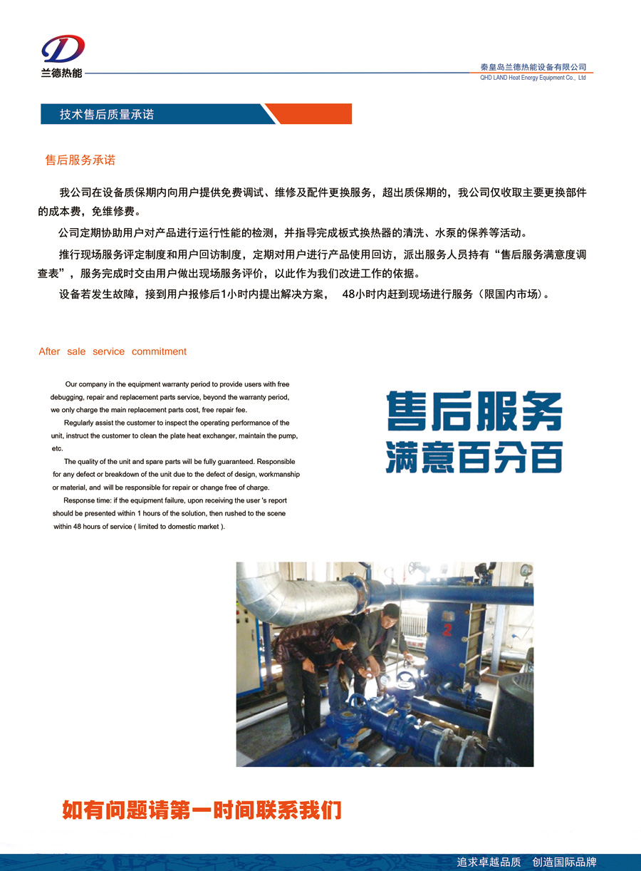公司秉承“追求卓越品質(zhì),創(chuàng)造國(guó)際品牌”的經(jīng)營(yíng)理念,隨時(shí)為客戶提供全球領(lǐng)先的換熱解決方案,專(zhuān)業(yè)提供高品質(zhì)的換熱設(shè)備和快速、高效的服務(wù),并贏得了行業(yè)領(lǐng)域多家客戶的信賴。許多國(guó)家重點(diǎn)工程項(xiàng)目及全國(guó)各大熱力公司都使用了我公司的產(chǎn)品,如大同熱力公司、包頭熱力公司、蘭州熱力公司、西山煤電熱力公司、釣魚(yú)臺(tái)國(guó)賓館、北京國(guó)資委、國(guó)家大劇院、大眾汽車(chē)、長(zhǎng)慶油田等。蘭德熱能將竭誠(chéng)為您提供優(yōu)質(zhì)的產(chǎn)品和最好的服務(wù)!