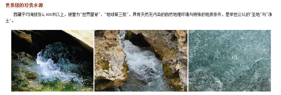 “5100西藏冰川礦泉水”來自西藏念青唐古拉山脈海拔5100米的原始冰川水源地,含有鋰、鍶、偏硅酸等豐富的礦物質和微量元素,其含量全面優于國家標準,純凈清澈,口味純正,是天然優質復合型礦泉水。西藏5100采用世界先進設備,運用嚴謹的生產工藝在水源地灌裝,保存了天然礦泉水源的優異品質。