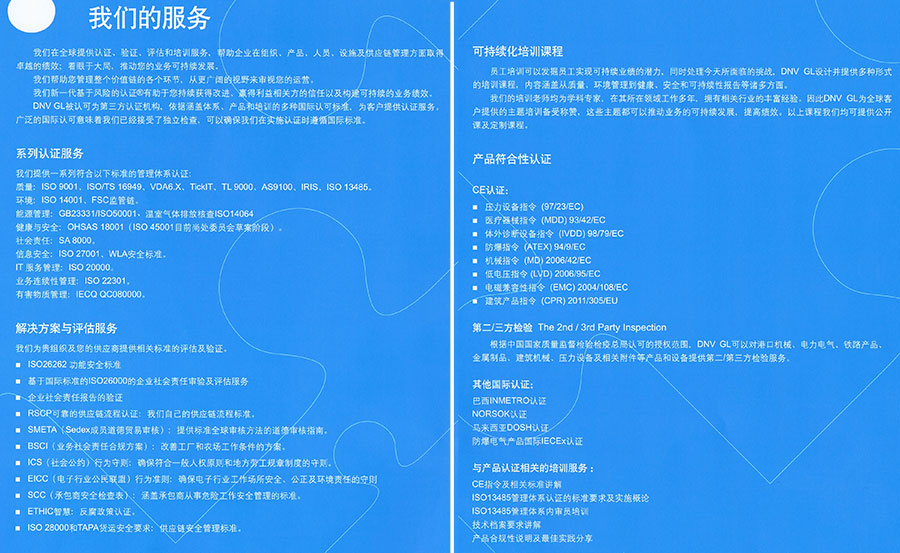 作為一家世界領(lǐng)先的提供管理服務(wù)的國際機構(gòu),DNV GL通過為客戶提供認(rèn)證、驗證、評估和培訓(xùn)服務(wù),確保客戶在組織、產(chǎn)品、人員、設(shè)施以及供應(yīng)鏈管理方面取得卓越的業(yè)績。我們始終與客戶通力合作,幫助客戶構(gòu)建一個業(yè)務(wù)可持續(xù)發(fā)展的平臺,并贏得利益相關(guān)方的信任。