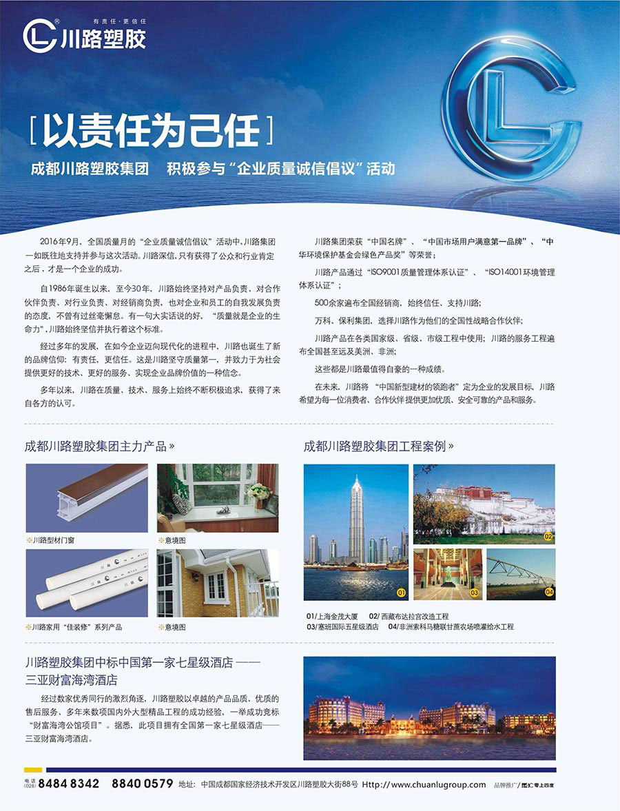 川路塑膠集團在全國擁有分公司、總經銷、特約經銷600余家,組成了較完善的營銷與服務網絡,并與萬科、保利、招商、陽光壹佰等著名地產公司形成戰略合作。“川路管材”、“川路型材”等系列產品廣泛應用于國內(外)城市化建設的建筑給(排)水、建筑門窗、電器穿線、電網改造、市政建設、農網改造、石油化工、新農村建設等眾多領域。主要工程包括:毛主席紀念堂改造、小平故里、釣魚臺國賓館、多國駐我國大使館、布達拉宮改造、四位機庫、二灘水電站、北京2008奧運主體育館、上海世博園、三亞博鰲論壇會址、重慶朝天門廣場、成都地鐵、5·12災后重建工程、喀麥隆議會大廈、賽班國際五星級酒店、巴哈馬國家體育館、非洲農場噴灌給水工程等。