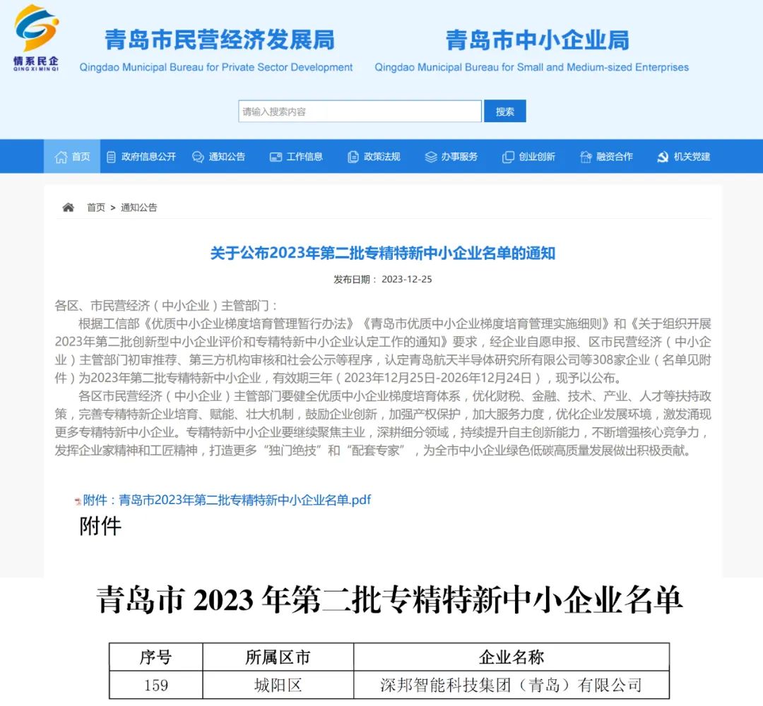 12月25日,青島市民營經濟發展局發布了《關于公示2023年第二批專精特新中小企業名單的通知》,深邦集團憑借卓越的創新技術、完善的產品體系、高效的運營模式以及穩健的經營實力順利通過層層審核,獲評2023年第二批“專精特新”中小企業。
