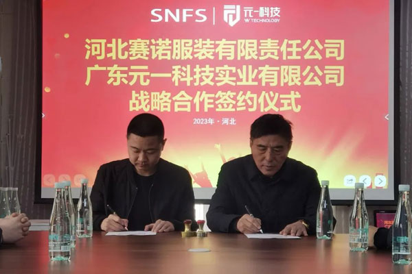 2023年2月27日,河北賽諾服裝有限責任公司同廣東元一科技實業有限公司在石家莊品匯大廈簽署了戰略合作協議,河北賽諾將引進十臺價值數百萬元的自動鋪布和自動裁床設備,旨在通過加強雙方在科技方面的協作進一步深化戰略伙伴關系,推動雙方在數字化、自動化、智能化等方面的深度合作和公司的長遠發展。