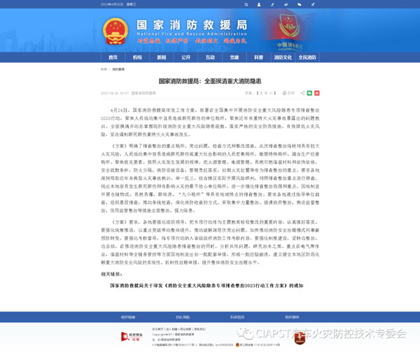 4月24日,國家消防救援局印發(fā)工作方案,部署在全國集中開展消防安全重大風險隱患專項排查整治2023行動,聚焦人員活動集中且易造成群死群傷的單位場所,聚焦近年來重特大火災(zāi)事故暴露出的問題教訓,全面摸清并動態(tài)掌握現(xiàn)階段消防安全重大風險隱患底數(shù),落實嚴格的安全防范措施,有效降低火災(zāi)風險,堅決遏制群死群傷重特大火災(zāi)事故發(fā)生。