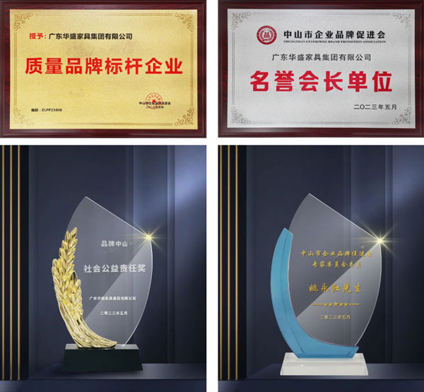 華盛家具集團憑借卓越的品牌實力獲頒“質量品牌標桿企業”、“品牌中山社會公益責任獎”、“名譽會長單位”榮譽稱號,同時,姚永紅董事長獲聘“中山市企業品牌促進會專家委員會委員”。