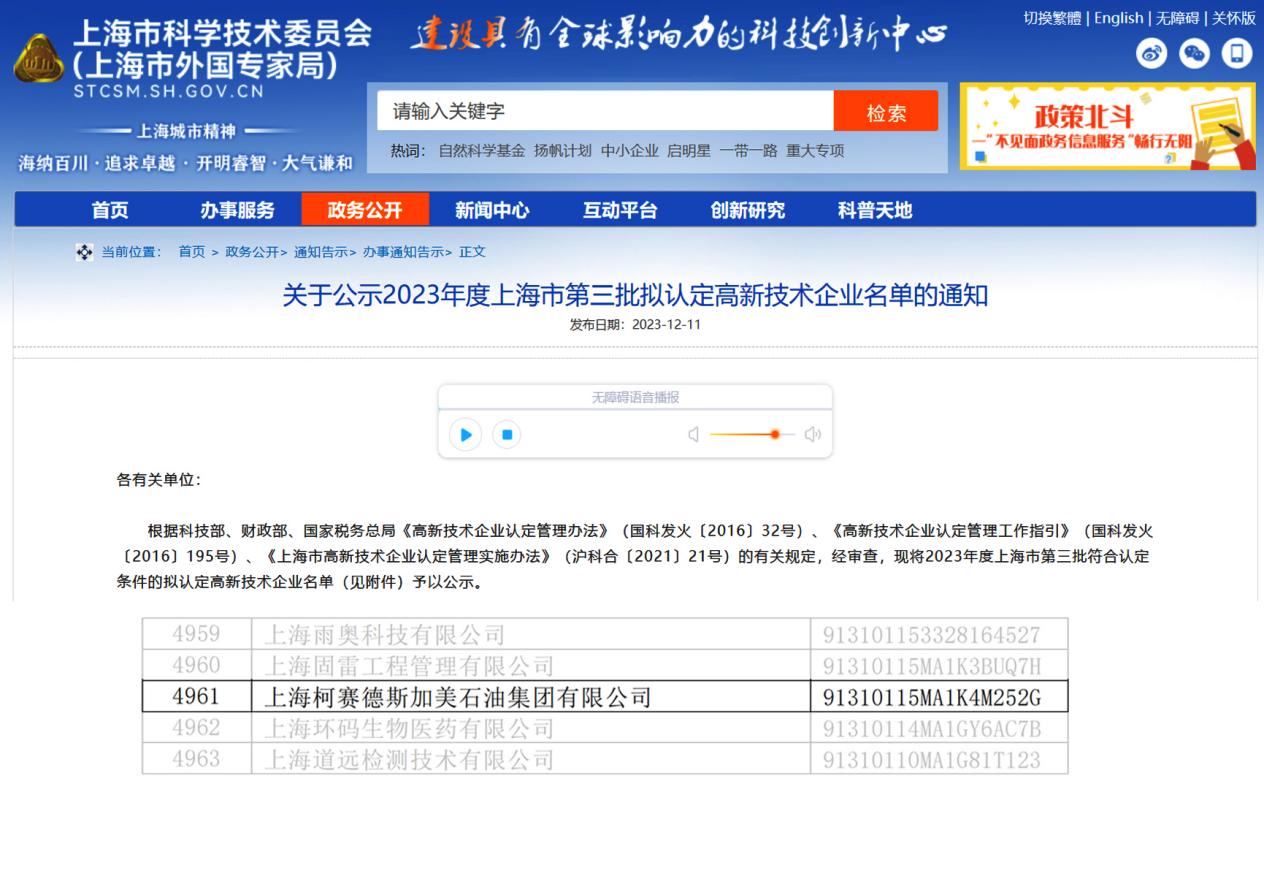 柯賽德斯加美石油集團被認定為“高新技術”企業