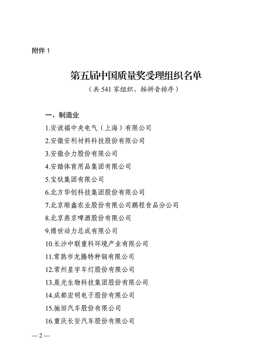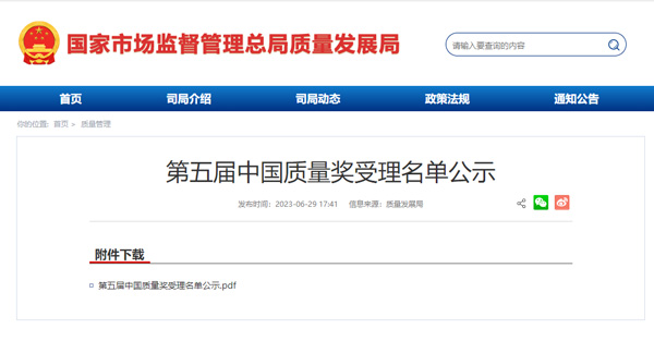 第五屆中國質量獎受理名單公示(附全名單)