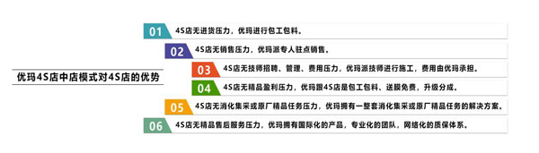 針對汽車主機廠和4S店渠道,優瑪進行了服務創新升級,從傳統的售后服務升級成包括優質產品推薦、差異化的產品及技術培訓、整車加精品一體式的項目運營指導、階段性店面活動營銷策劃、售后優先賠付、增值服務營銷等等全方位的咨詢式服務營銷模式。30多家4S店集團和車廠超2000家4S店的優質服務經驗,奠定了優瑪品牌已成為中國4S渠道最專業的太陽膜項目整體運營服務解決方案提供商之一的行業領航者地位。