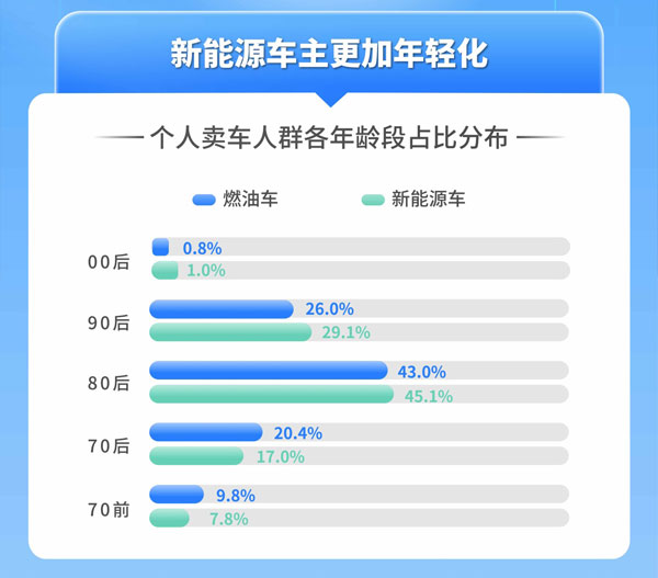 據天天拍車數據顯示,個人賣車車主年齡段分布占比,新能源車車主80后占比45.1%,90后占比29.1%,00后占比1.0%,對應燃油車車主占比分別為43.0%,26.0%,0.8%。在越來越成熟的新能源汽車技術和促消費政策的加持下,新能源汽車保有量不斷增加,確保了二手車市場交易中新能源二手車車源充足,不少消費者在兼顧嘗“新”和性價比的心態下,選擇消費新能源二手車,不失為一個比較理性的消費心理。