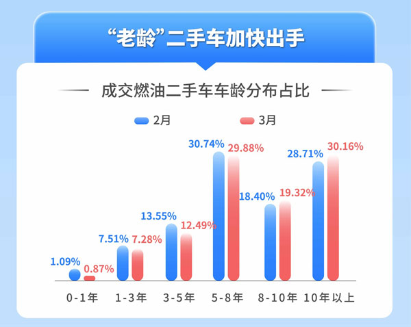據天天拍車數據顯示,3月燃油二手車成交車齡分布中,8-10年車齡成交占比為19.32%,10年以上成交占比為30.16%,合計占比49.48%;相較于2月,8-10年車齡成交占比為18.40%,10年以上成交占比為28.71%,合計占比47.11%,環比提升2.37%。此外,3月0-3年車齡的次新車成交占比為8.15%,比2月微跌0.45%,3-8年車齡成交占比為42.37%,比2月下降1.92%。數據顯示了在多重因素影響下,車主一方面選擇出手“老齡車”,對于次新車選擇“惜售”觀望。
