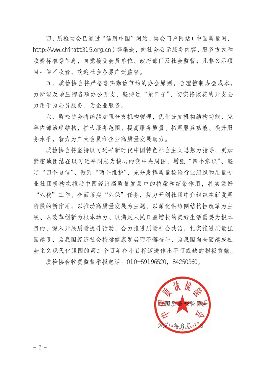 中國質量檢驗協會收費自律承諾書