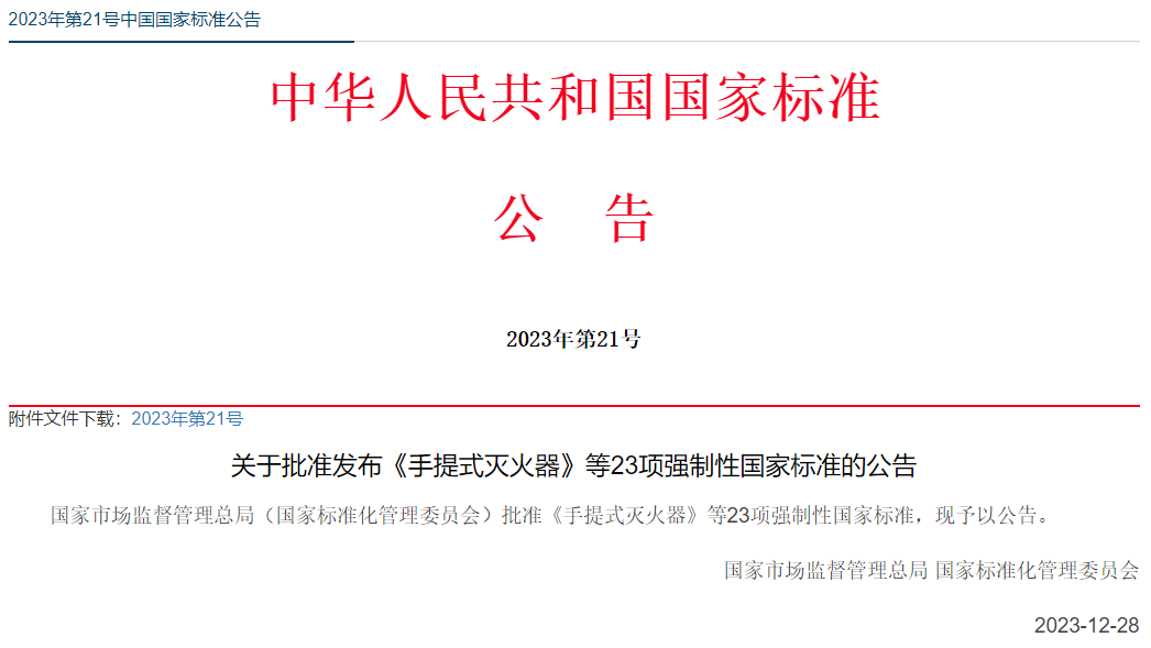 近日,2023年第21號國家標準公告發布,國家市場監督管理總局(國家標準化管理委員會)批準發布《手提式滅火器》等23項強制性國家標準,詳情如下: