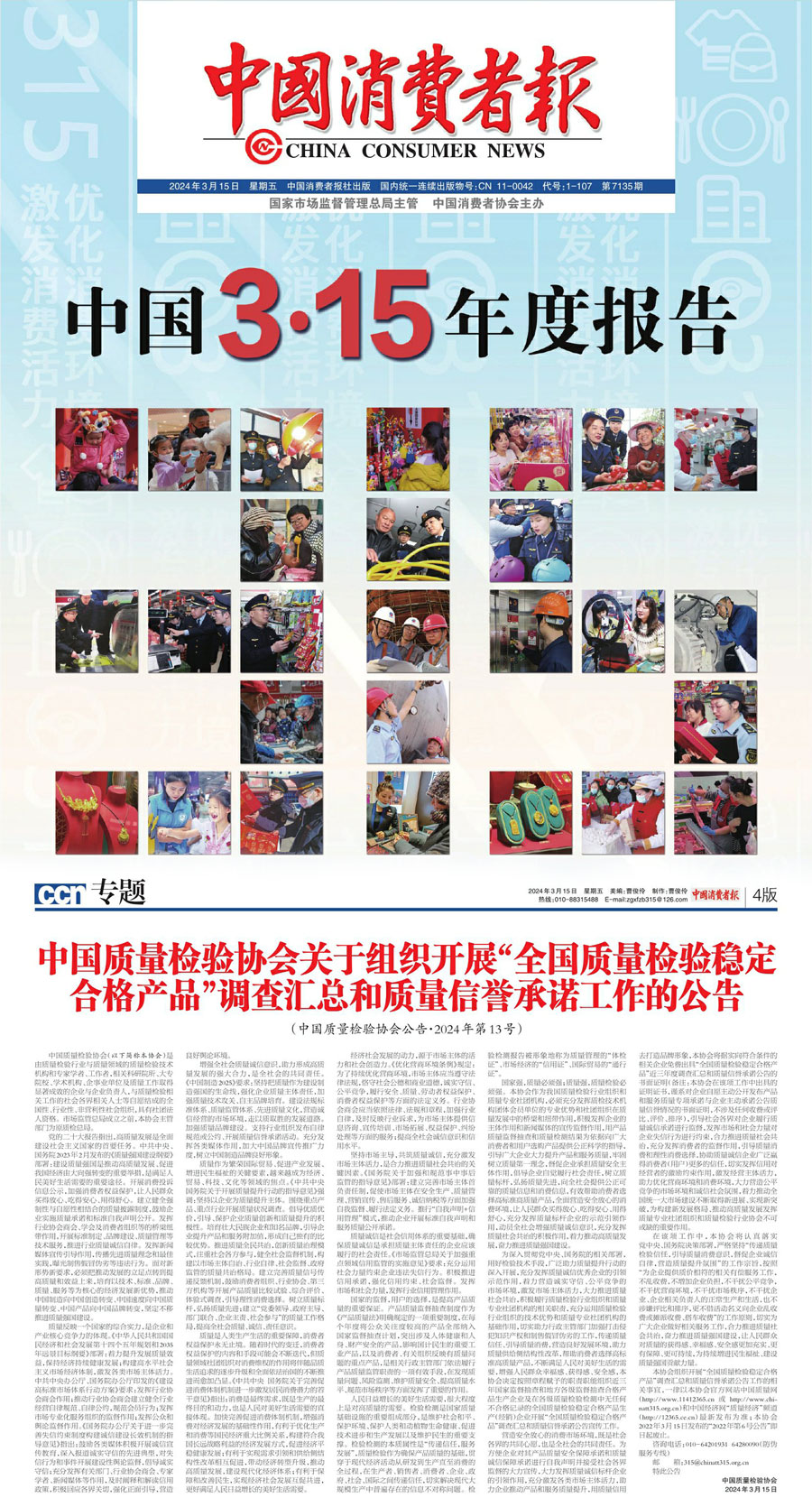 中國消費者報:中國質量檢驗協會關于組織開展2024年“3·15”產品和服務質量誠信承諾主題活動的公告
